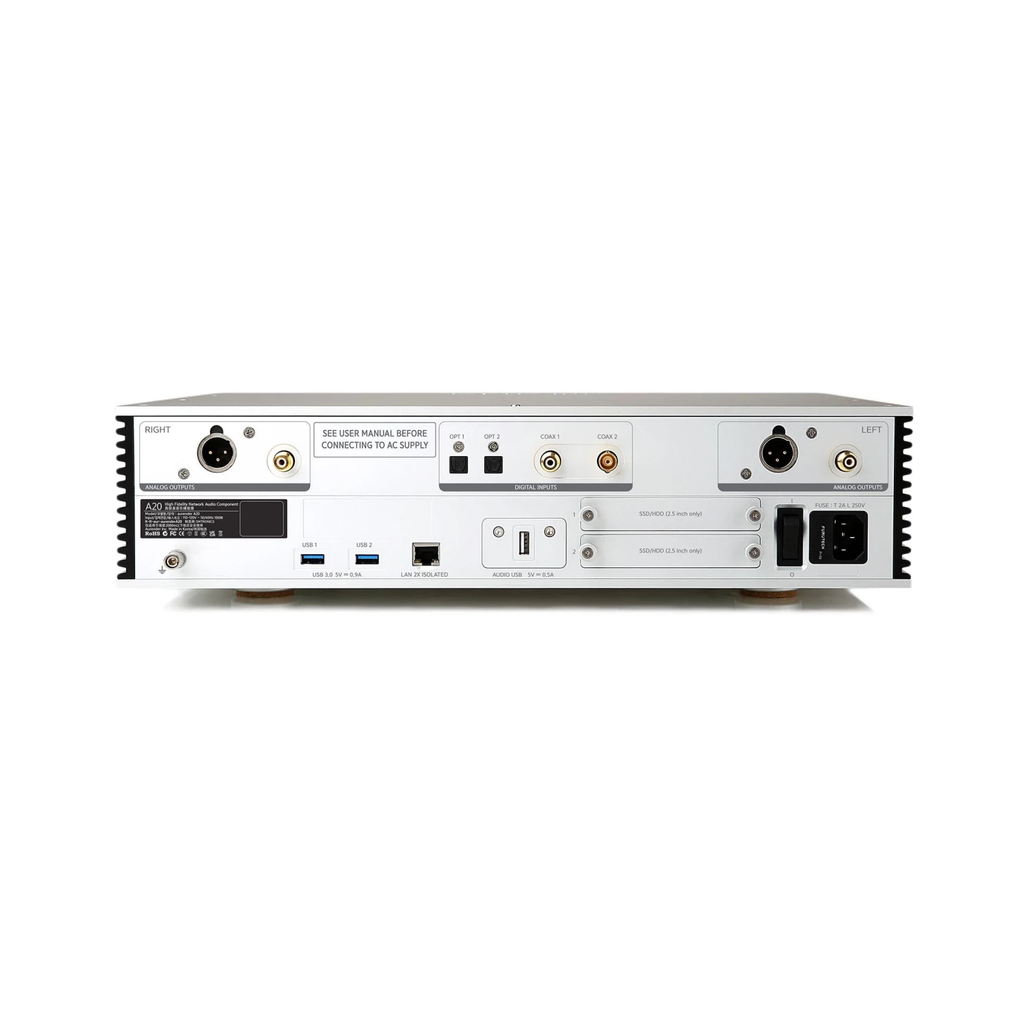 The A20 is based on the flagship A30 streaming DAC and offers the same audio quality with an edited feature set. While the A30 is aimed at customers with large disc collections, the A20 dispenses with CD ripping and metadata handling, and does not come with built-in storage, though you have the option to add two 2.5″ drives. The A20 also has fewer headphone outputs, offering just one 1/4″ jack.