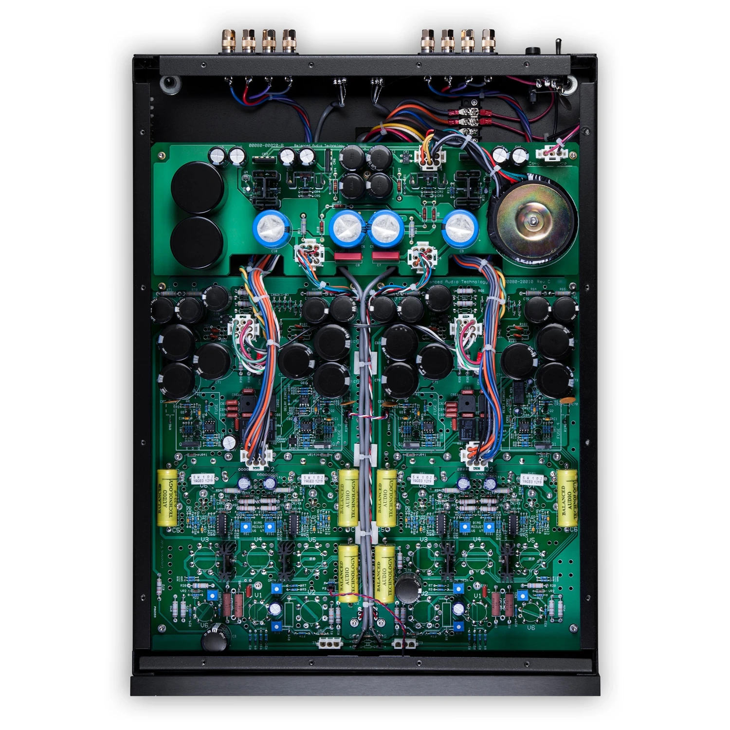 Compared to the previous generation of REX products, the REX II Power amplifier substantially improves its gain stage architecture by extending the benefits of vacuum-tube current sources to include both the first and second gain stages of the circuit design. The current source is an integral, albeit extremely important, part of a differential circuit. Its quality to a large degree determines the ultimate performance of a gain stage. As opposed to a more common resistive solution, the vacuum-tube current source is much closer to an ideal model. The benefits of implementing dual current-sources within the REX II Power amplifier are several-fold: