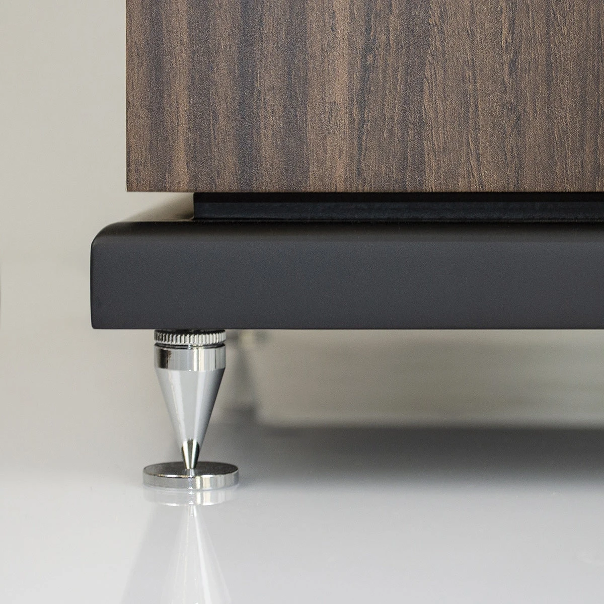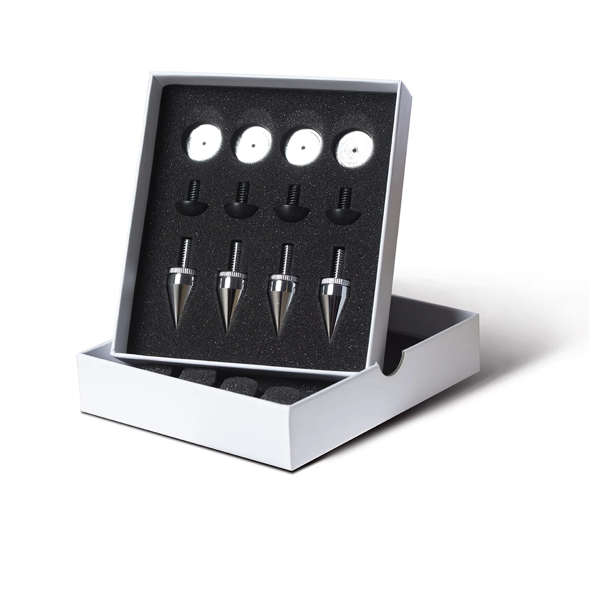 - Chrome-plated steel spikes or rubber feet for proper decoupling