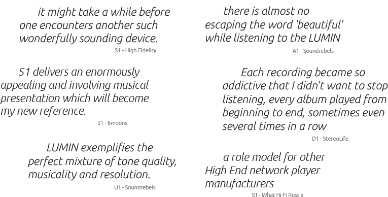 Since its launch, news of LUMIN A1 has spread to all corners of the globe, with awards and reviews coming from the industry’s most respected websites and magazines. Computer Audiophile described LUMIN as “the network player by which all others should be judged” and 6moons’ Joël Chevassus described DSD through LUMIN as “the most exciting audio experience I’ve yet had”.
