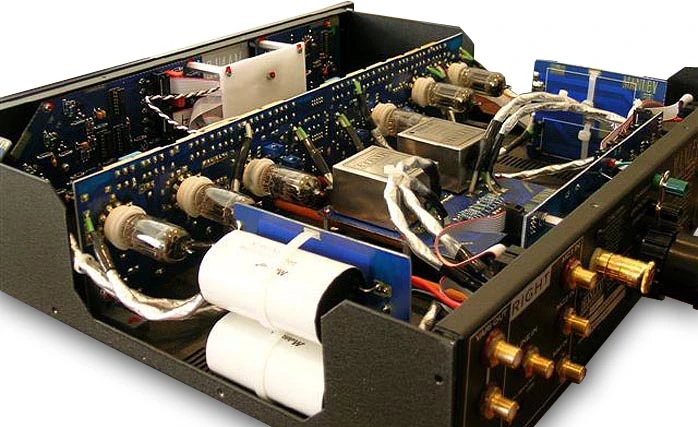 You can drive the Steelhead directly into an amplifier if you so desire. It is equipped with a pair of variable outputs, controlled via the knob on the faceplate or the new Remora Remote. There’s even a LINE LEVEL input, so you can even hook up another external source and use the Steelhead as a preamp! If you happen to have three turntables set up, we give you 2 x MC and 1 x MM selectable inputs! The Variable and Fixed level outputs are also totally vacuum tube buffer circuits and deliver really low impedance high current drive. Like inherently 20 ohms plus the little 47 ohm “OK drive those high capacitance audiophile cables why doncha” resistor, so it’s real output impedance is only 67 ohms. No wanky cathode follower (oh bor-ing) output here like the other guys. We got your real low impedance all-tube outputs right here! It will drive anything and everything. Long cables, no problem.