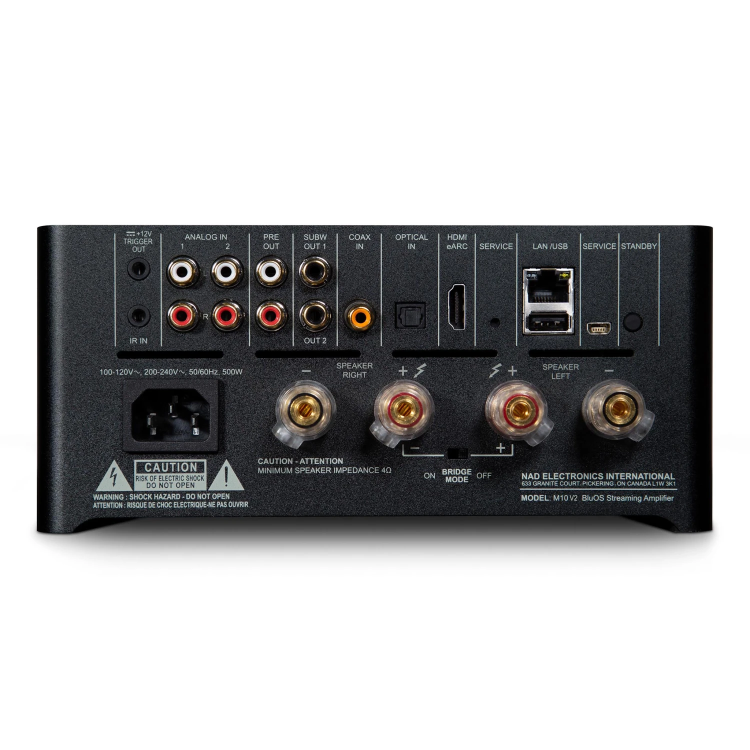 Along with audiophile-grade speaker terminals, it has two independent subwoofer jacks, whose output settings are adjustable from the BluOS app. The M10 V2 adds Dolby Digital surround-sound decoding. Home-theatre fans can configure a pair of BluOS surround-enabled wireless speakers or amplifiers to play the surround channels, while the main speakers handle the front channels, so that the M10 V2 serves as the hub of a 4.1- or 4.2-channel Dolby Digital surround setup. The M10 V2 transmits the rear channels wirelessly, with very low latency, so you don’t have to run wires around your room to connect the surround speakers.