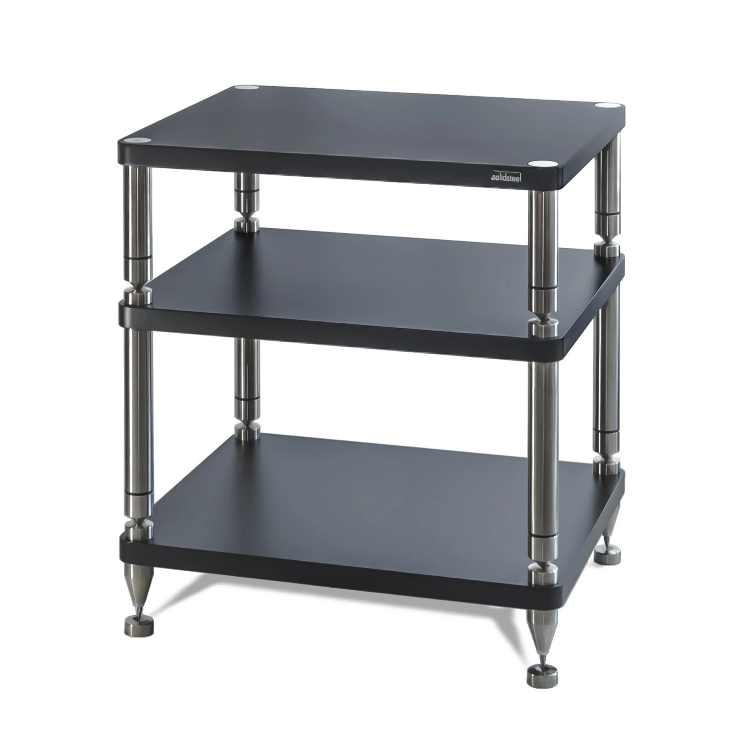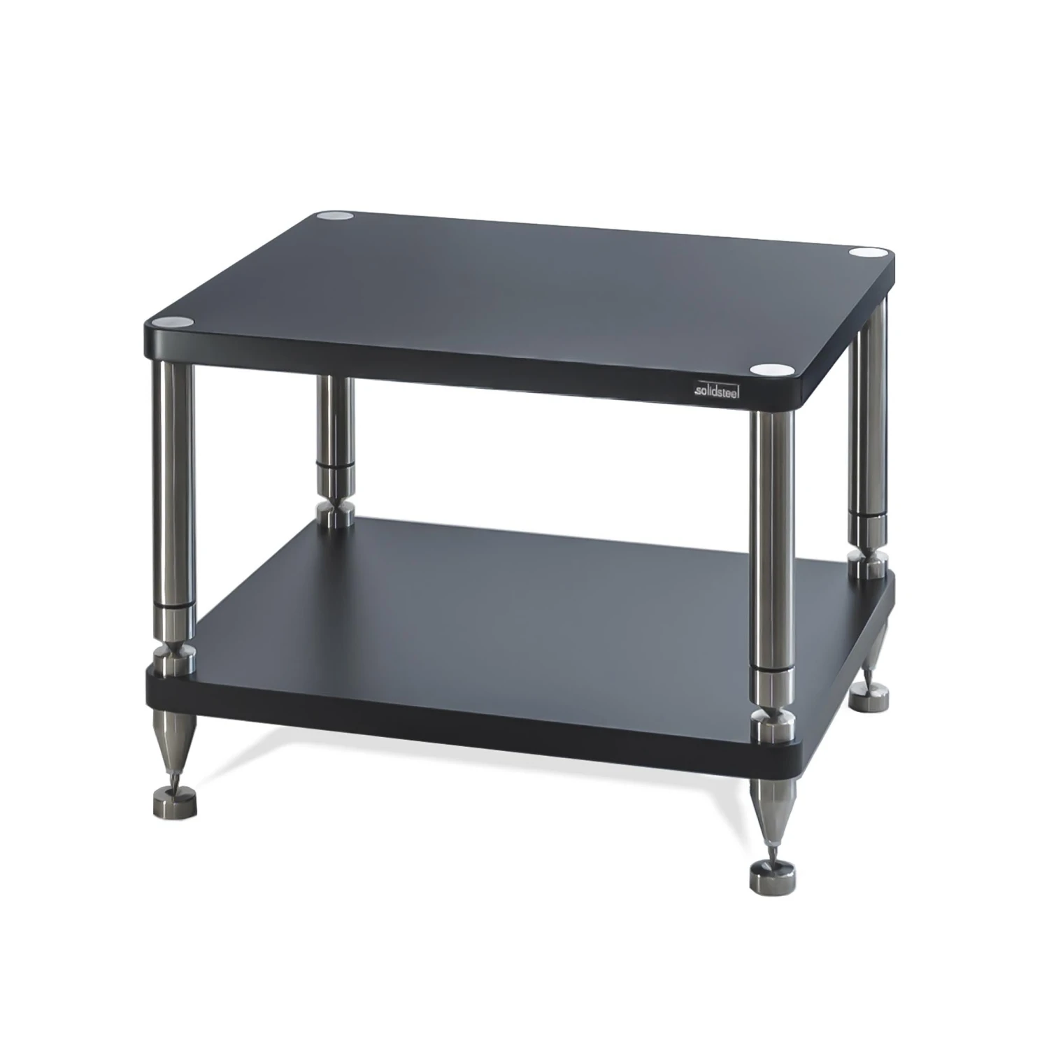 The large adjustable bottom spikes are made from stainless steel and allow for perfect leveling of the structure. All the hardware frame parts are designed with inner spikes that improve the isolation of any components placed on the rack.