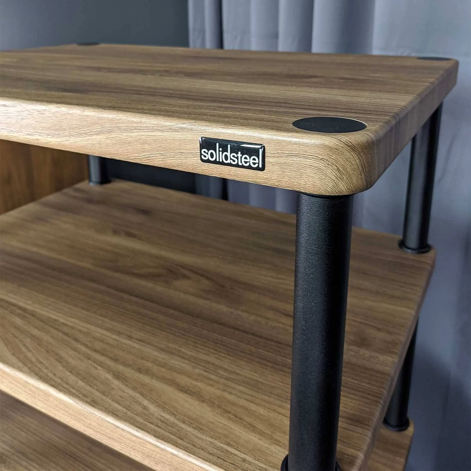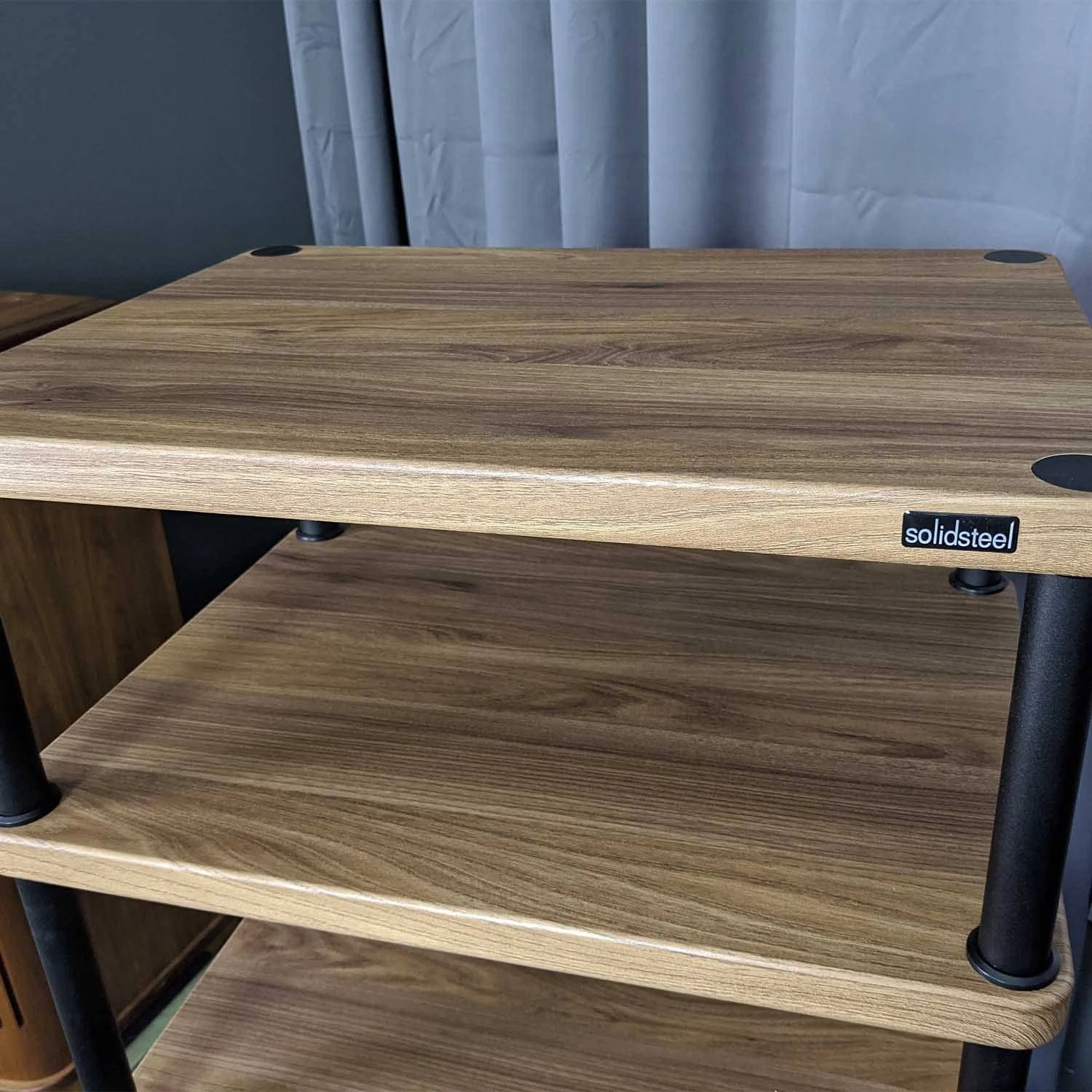 The S3 Series draws inspiration from decades of production results achieved by previous Series 3, 5 and 6. For over 20 years, Solidsteel has made high-quality, all-Italian audio stands. The S3 line uses anodized aluminum posts filled with damping material, with stainless steel hardware. The shelves are MDF with a polymer laminate.
