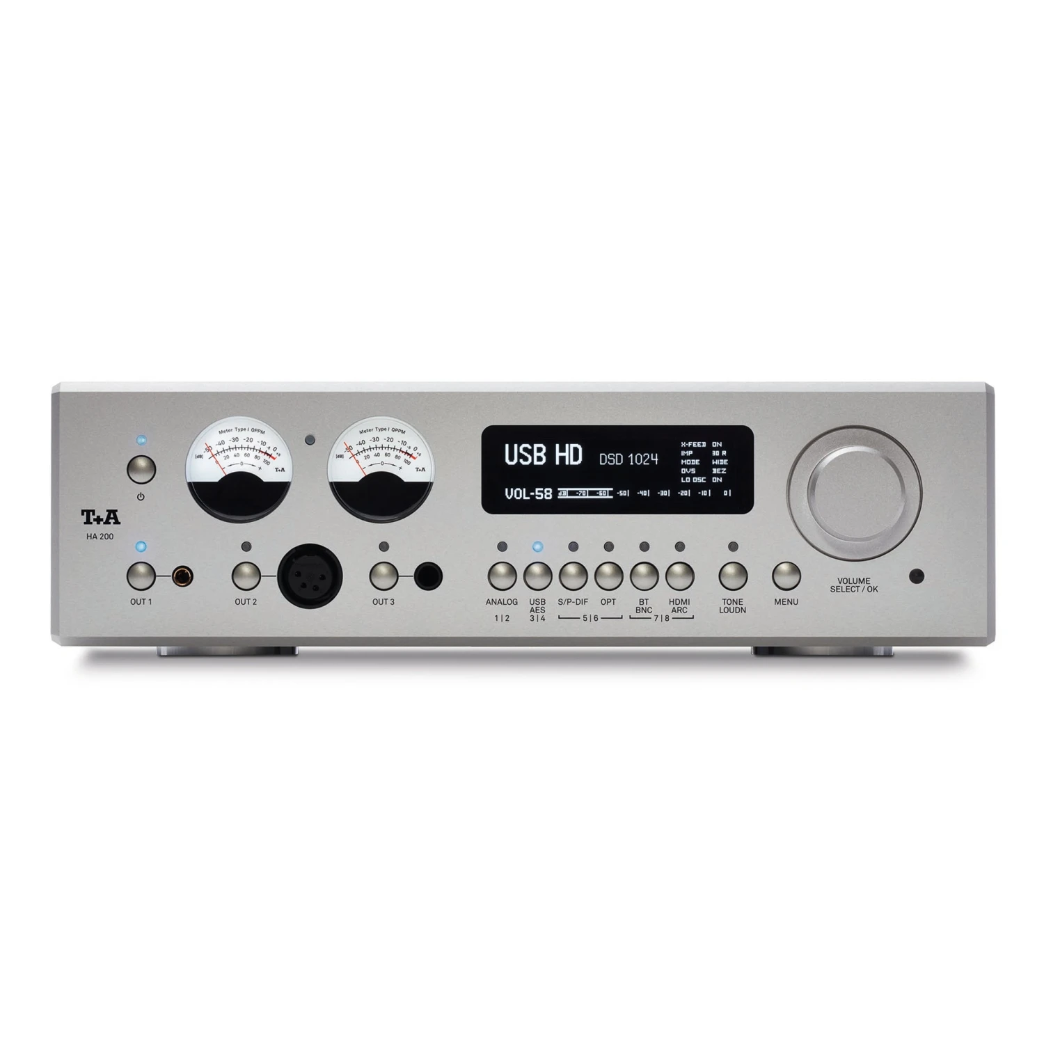 The wide range of connections is controlled by a very sophisticated system, making the HA 200 intuitive to use and excellent sounding. The two VU meters (QPPM = Quasi Peak Programme Meter Type 1) are not just for show, but are accurate and can be used in studio applications. The level at the D/A converter and the amplifier can both be displayed, as can input level and output level, temperature, and stream quality (which can be used to check the frequency of the data stream and even the cable quality). The sharp display can also show output impedance, volume, data rate, oversampling filter type, or crossfeed. Brightness and color are adjustable.
